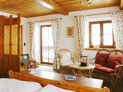 Das Landhausdoppelzimmer ist ausgestattet mit Sitzecke und Balkon nach Osten (Sonnenaufgang und Blick auf den "Falkenstein"). Es befindet sich im 2. Stock des Altbaus und hat ein Bad mit Badewanne. Es ist sehr beliebt, da es zwar das kleinste Zimmer des Binderhäusl ist, aber dafür sehr gemütlich und wohnlich ist und eine nette Sitzecke hat.